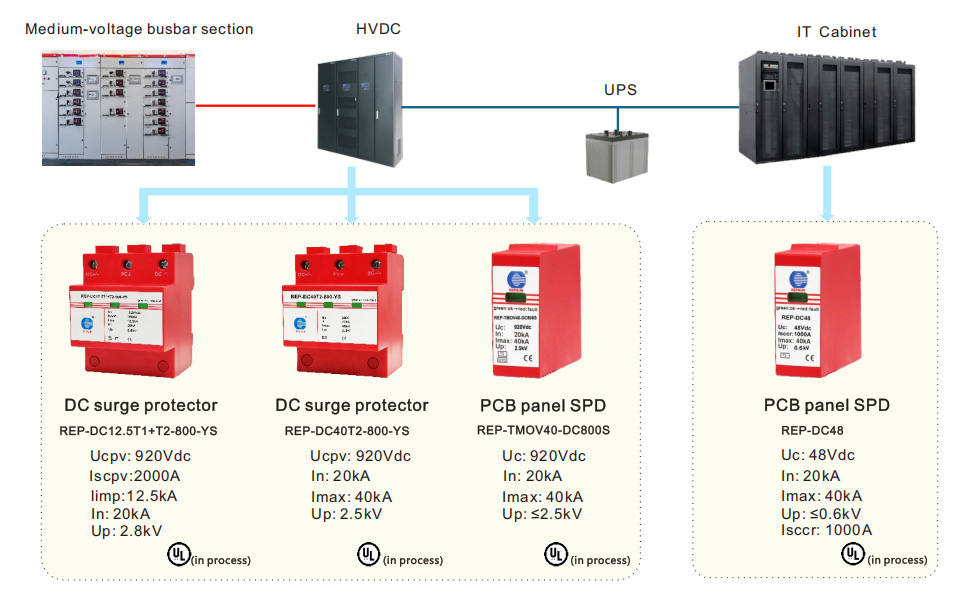 Con el continuo aumento de la densidad de potencia informática de la computación de alto rendimiento, la arquitectura de energía de los centros de datos está acelerando su transición a un sistema de alta tensión de corriente continua (HVDC) de 800 V. La arquitectura de 800 V puede reducir significativamente las pérdidas de energía en la red de distribución eléctrica, mejorar la eficiencia energética general y proporcionar soporte técnico para el despliegue a gran escala de gabinetes de nivel megavatio. El HVDC de 800 V no es solo la infraestructura de racks actual, sino una infraestructura de IA orientada al futuro. El despliegue de HVDC de 800 V a nivel de instalación plantea nuevos desafíos para la protección contra sobretensiones y la puesta a tierra de los centros de datos. Para cumplir con los nuevos requisitos de protección HVDC, REPSUN proporciona soluciones confiables de protección contra rayos para HVDC de 800 V a 2000 V para centros de datos de IA.